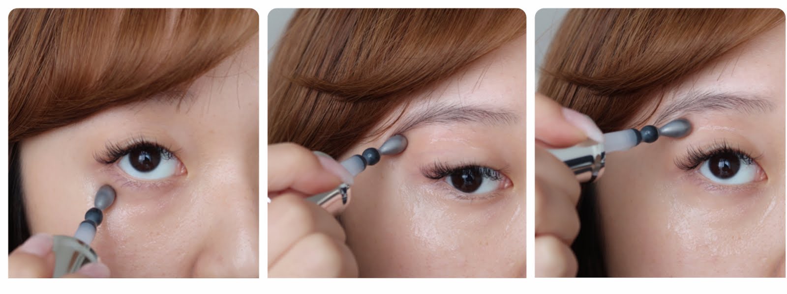 1. 以按摩棒在眼睛下方快速打圈,由內眼角畫向外眼角,撫平黑眼圈和眼袋。