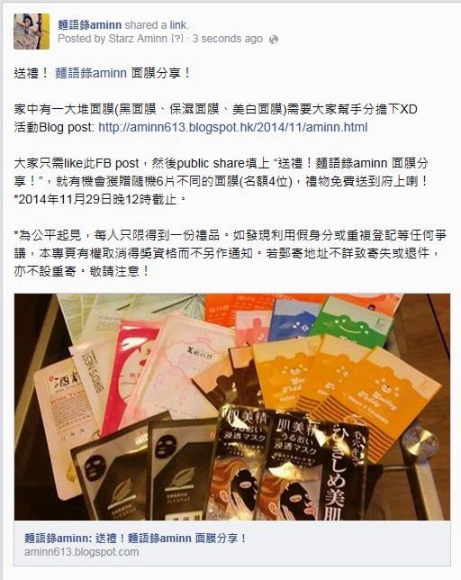 大家只需like此FB post,然後public share填上 “送禮!麵語錄aminn面膜分享!”,