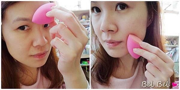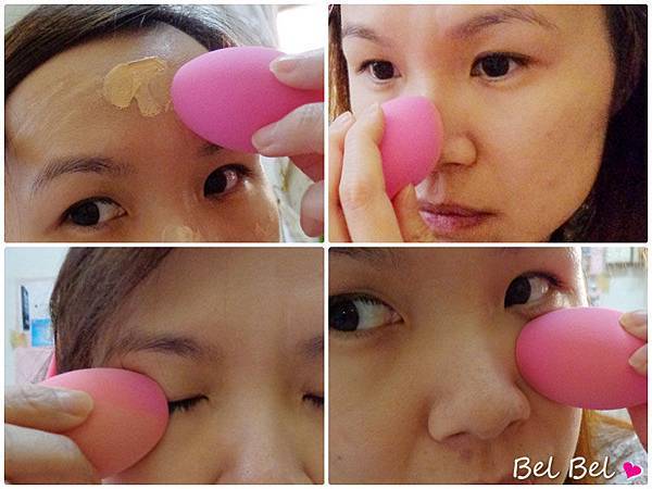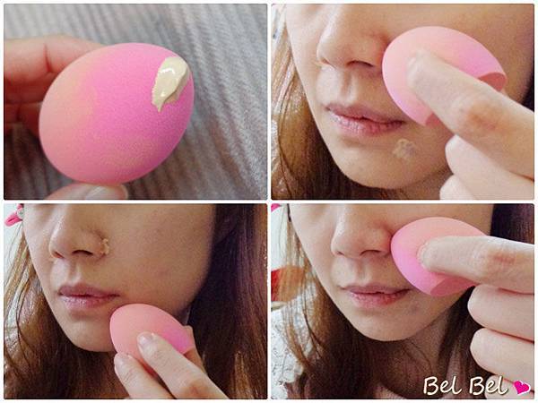 如果用 BB Cushion 的話,便先把美妝蛋輕壓在 Cushion 上,讓美妝蛋沾上 BB Cream 之後,便直接印在面上推勻。
