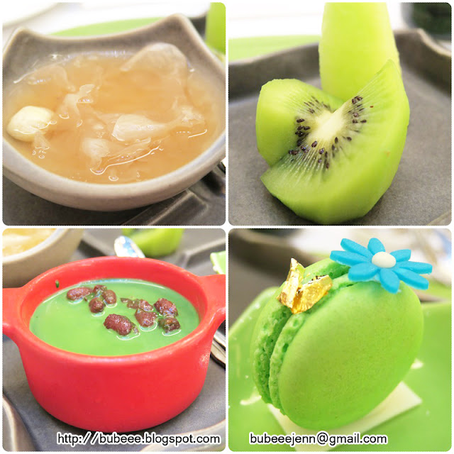 是日的晚餐餐單如下:鮮甜活氧當歸湯 Angelica Sinensis Soup → 橙萃曼波魚凍 Ocean Sunfish Jelly → 植萃綠森生菜捲 Oldham Bamboo Shoot Salad → 香料咖哩炒帶子 Scallop With hurried Duck’s Eggs Sauce → 翡翠清蒸海上鮮 Steamed Halibut → 麻油山藥嫩雞飯 Chicken Sesame Oil Rice → 綠茶胡麻絲瓜麵 Loofah Noodles With Tea Sauce → 梅蘭竹菊四君子 Dessert Set