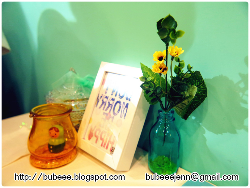 這家的座位有三張桌子,連桌上的佈置都很細緻,加上這種海綠色的背景也是挺難找的唷!(這樣看真的很有韓風的感覺唷。)