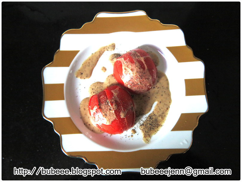 b) 將適量的丘比沙拉汁淋上蕃茄,再灑上黑椒碎粒即完成「日式芝麻汁蕃茄」。