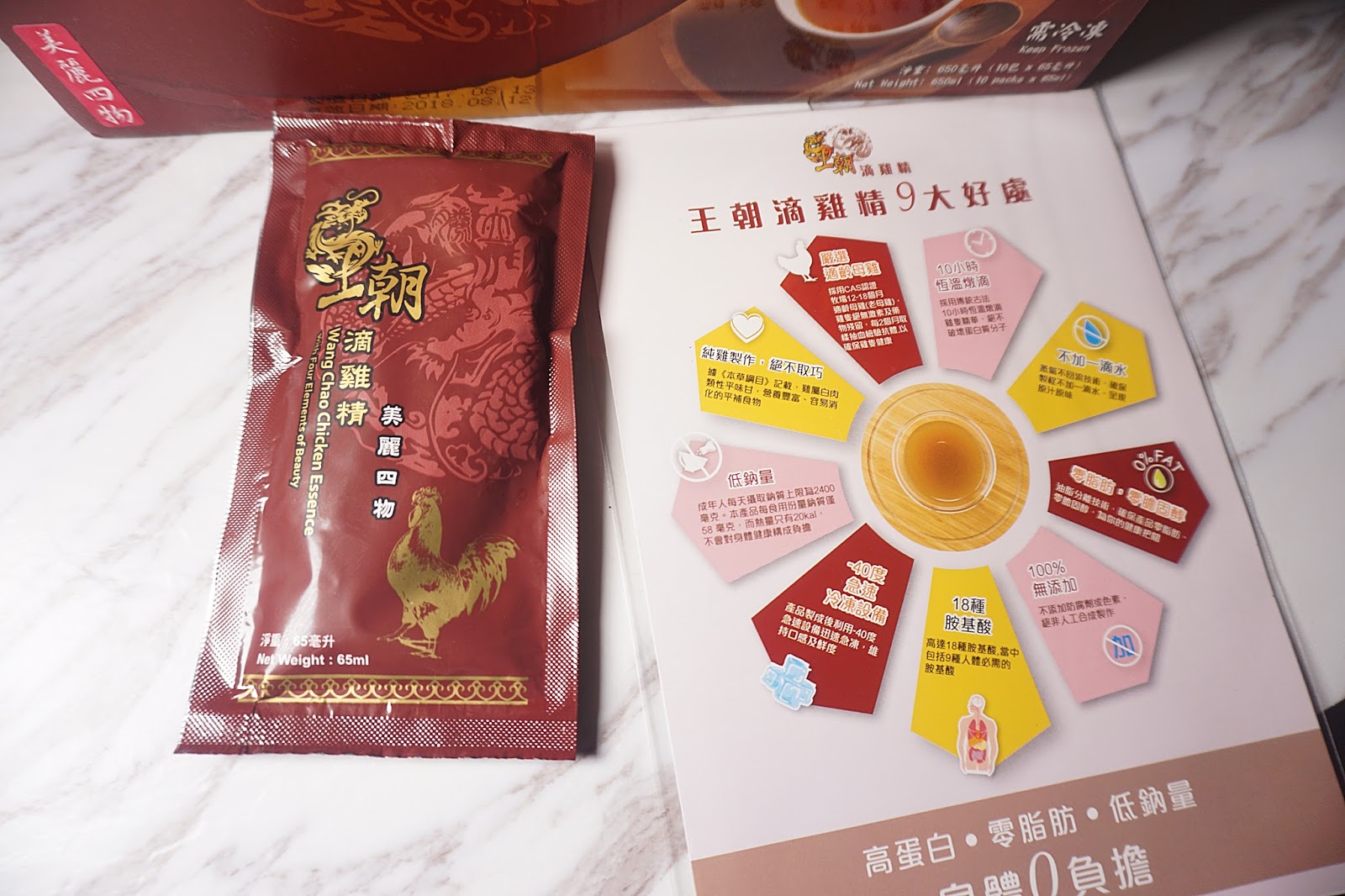 王朝嚴選有 CAS 認證(相等無藥物殘留)合法牧場的適齡母雞,飼養環境及雞隻健康得到保證,再用10小時以100度古法恆溫滴釀,過程中不加任何水份地萃取每一滴雞隻精華。古法提煉除了保留了雞湯的甘甜與香濃之外,同時去除了本來的油膩感及高熱量,令啖啖精華也是 “高蛋白”,“零脂肪” 及 ”低鈉量”。