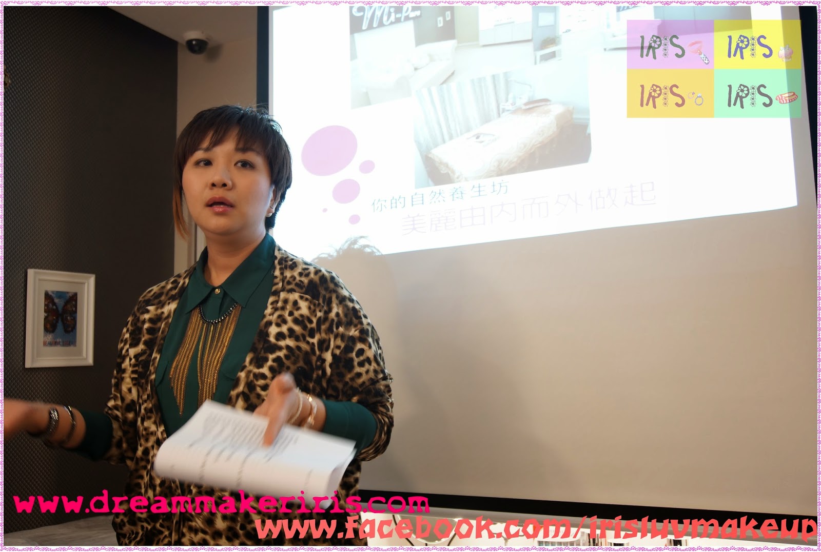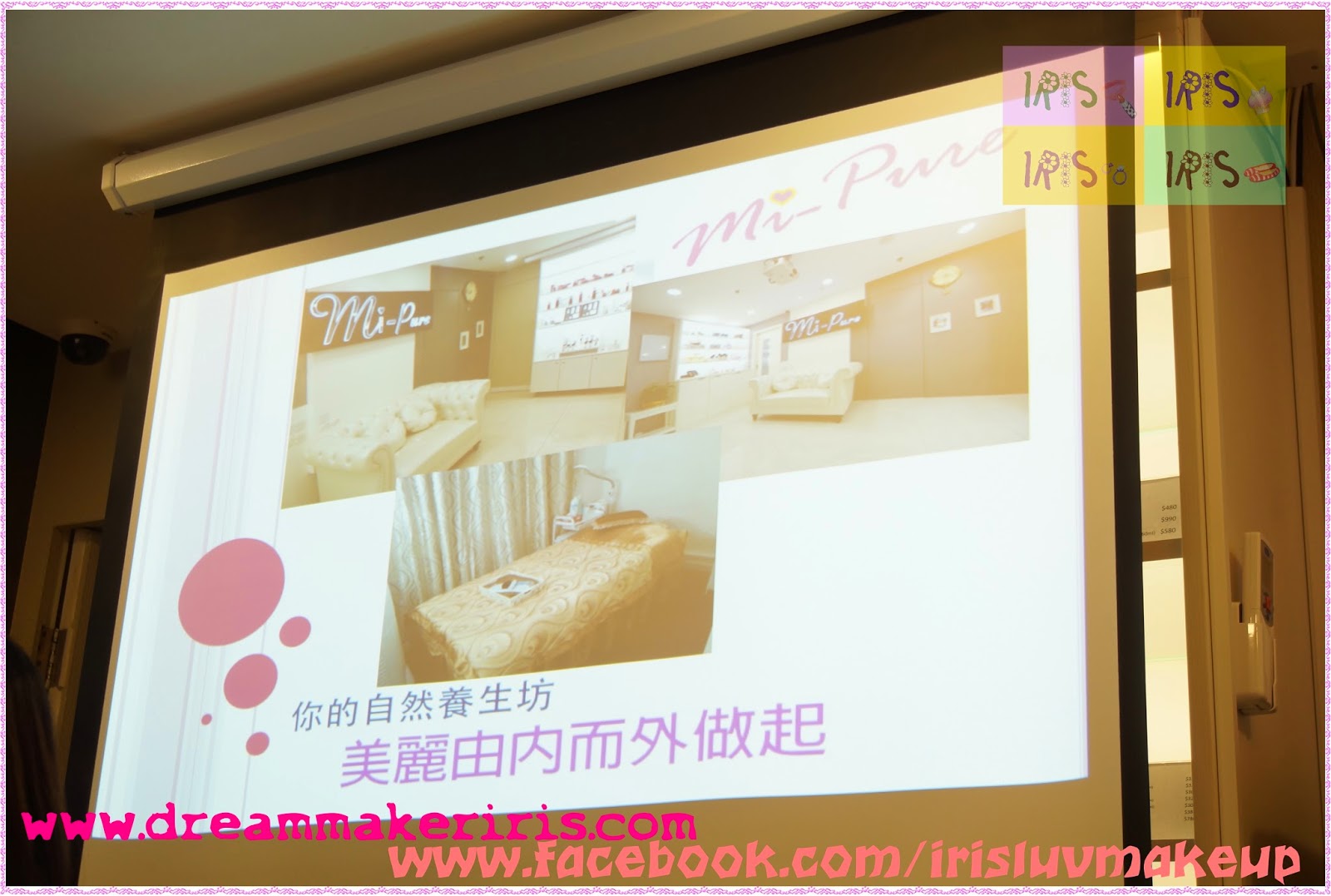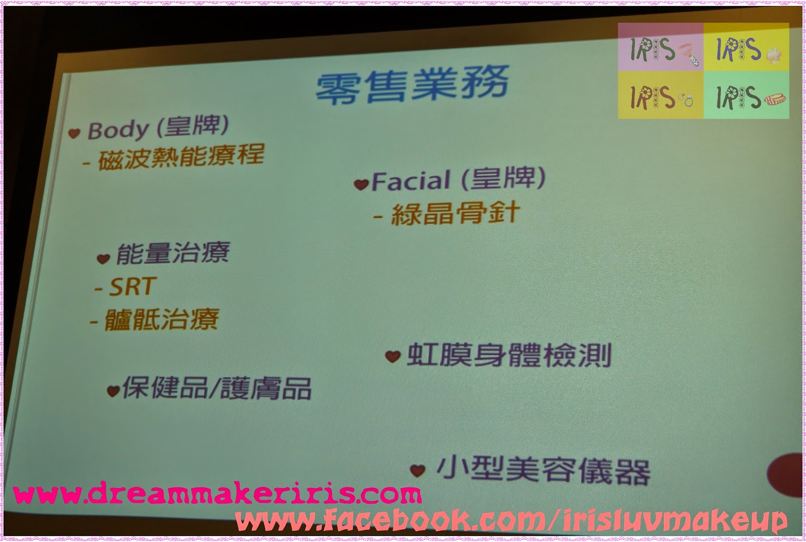 Sugar 先簡單為大家介紹一下公司的業務,除了一般面部及身體療程,連能量治療和虹膜身體檢測也有,也有自己家的保健及美容產品,還有美容儀器,真的很全面。