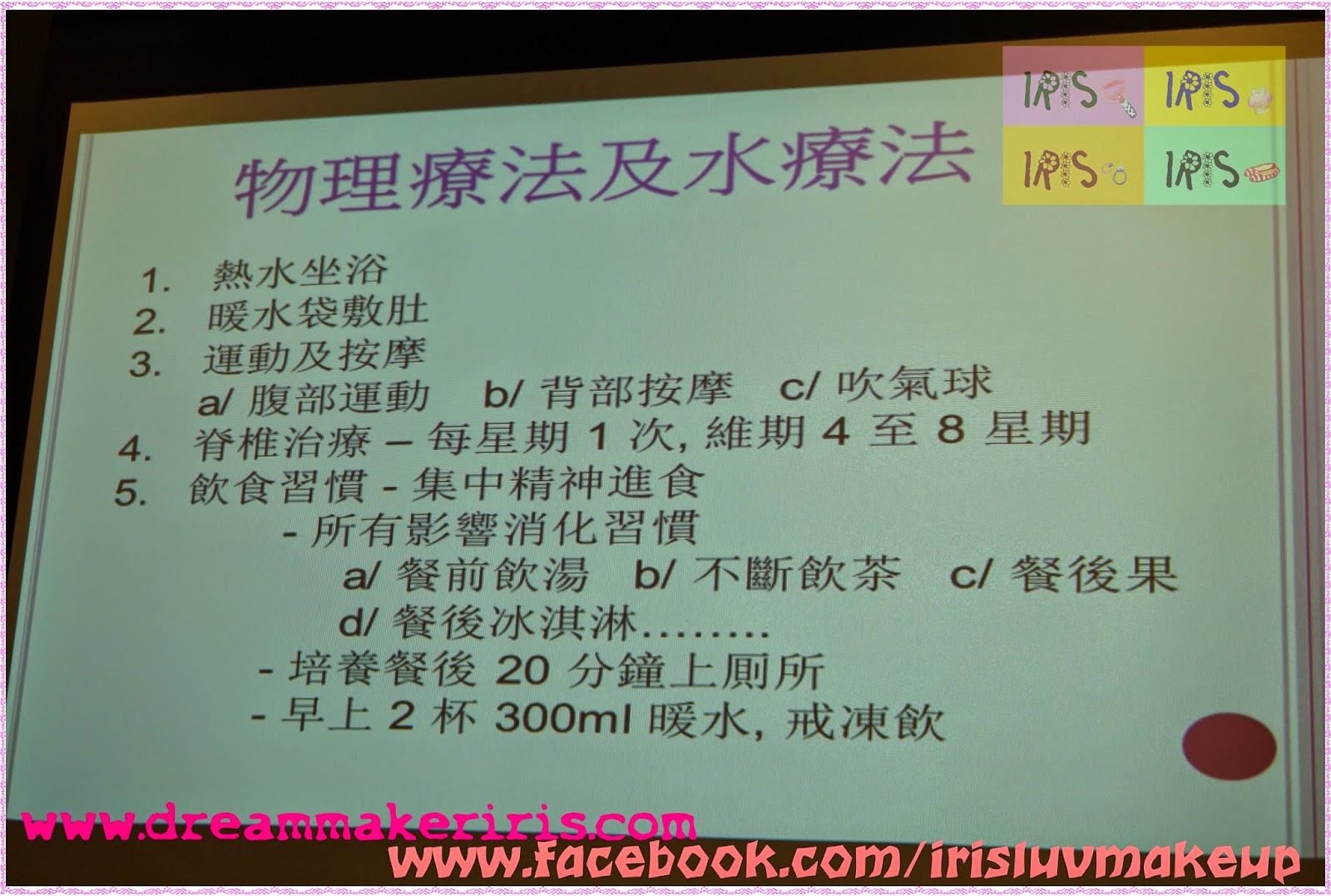 之後大家準備進入圖文並茂的養生課吧。(我懶,不再重覆打Power Point 的內容了。)