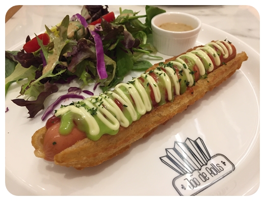我地就揀左 Wasabi 口味, 用 Churros 夾住香腸再加上醬汁;