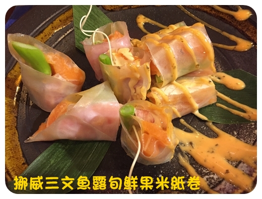 ❤ 挪威三文魚露旬鮮果米紙卷很特別的 Fusion 菜, 用上越泰菜常用的米紙包裹著挪威三文魚碎, 露旬及新鮮桃肉;