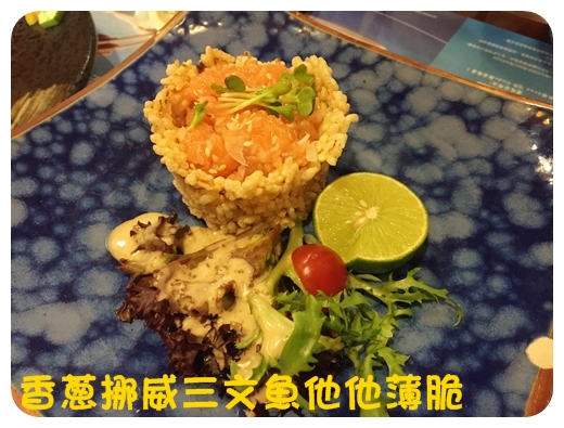 用上像米通的薄脆裝著香蔥挪威三文魚蓉;