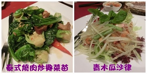 有泰式燒肉炒椰菜苗 (HK$80) 及青木瓜沙律 (HK$98)
