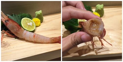 好大隻的牡丹蝦, 師傅已經剝好蝦身的殼;