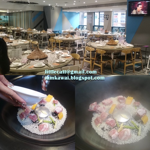 而石鍋底部有小孔把蒸餾水不停噴出, 蒸海鮮期間的配料及精華汁液流入預先的米及排骨.