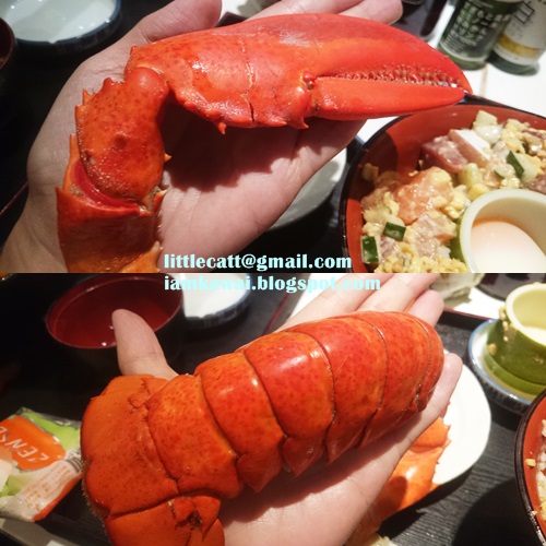大如手掌的龍蝦鉗已預先用鉗鉗開一條裂痕,輕輕一擰就可以拆出龍蝦肉,不過味道比已拆肉的龍蝦肉為咸。已拆肉的龍蝦身入面釀入了蟹籽飯,所以整個二段丼含飯量也不輕手,女生必定感到大滿足。