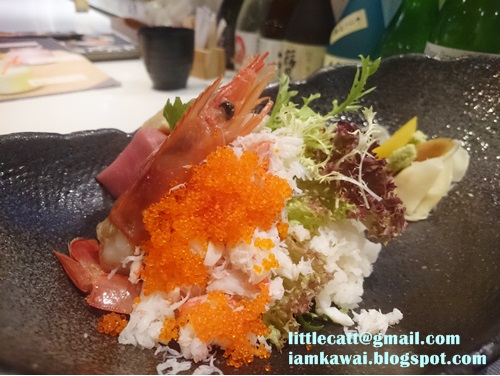 有齊油甘魚,三文魚,藍鰭吞拿魚赤身,赤蝦及蟹籽等刺身,每一件都是超厚切的。