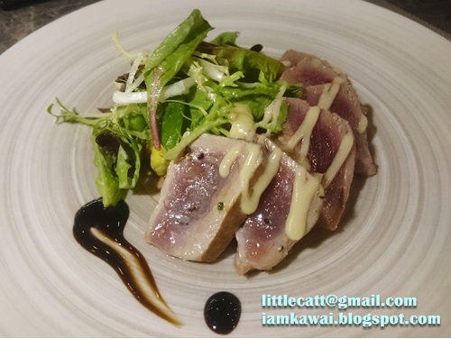 燒吞拿魚配牛油果沙律及香醋 $268,厚身吞拿魚件燒到半熟,吞拿魚獨有的魚油脂保存得很好,質感軟熟,燒至半熟還可以一口嚐到兩種口感,伴吃的牛油果沙律亦散發啖啖的果香,吃罷也不會有太膩之感!