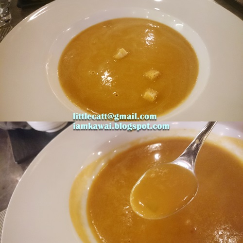 法式干邑龍蝦湯,龍蝦是以壺上枱,侍應在客人面前倒入吉碗中,而碟是熱的,所以不會把湯冷掉,每一口都夠溫度直至最後一口。湯底好香濃,質感比較稠身,飲完不覺口乾,甜甜的Aftertaste 在口腔內縈迴不散。