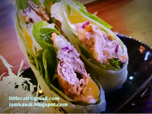外層是米紙加生菜,包著蟹柳,芒果,軟殼蟹,少量沙律汁,