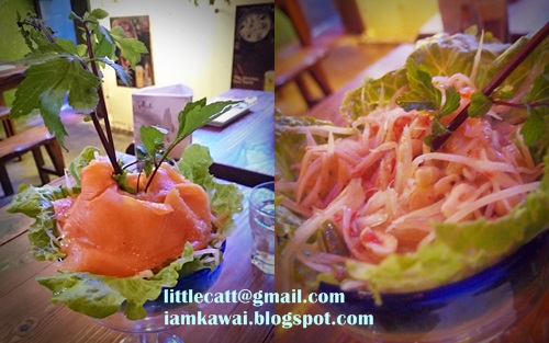 頂層的煙三文魚很大片厚身,下面入面放滿了青木瓜絲,口感爽脆,