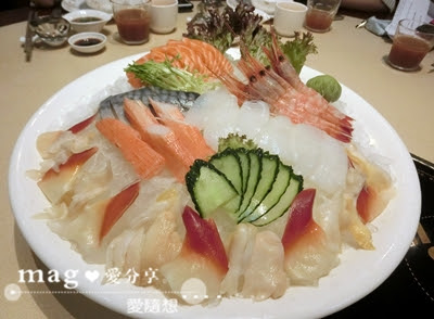 火鍋前先來個日式刺身拼盆開開胃 ~ 併盆由三文魚、甜蝦、北寄具、蟹棒、象拔蚌等刺身組成