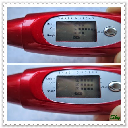 未搽乳液前, 水份和細緻度是2, 油份是5. 搽完後, 水份和細緻度即時提升到4, 而油份也減到4, 達到水油平衡, 對於暗瘡肌膚的我好重要.