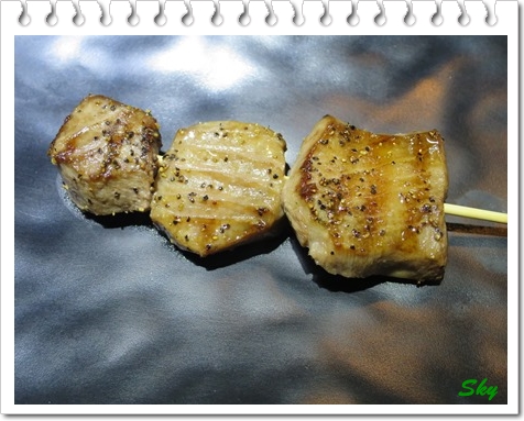 我點了厚切牛舌串, 墨汁墨魚腸, 蘑菇雞肉飯團,煙肉芝士大蘑菇和燒鯖魚.