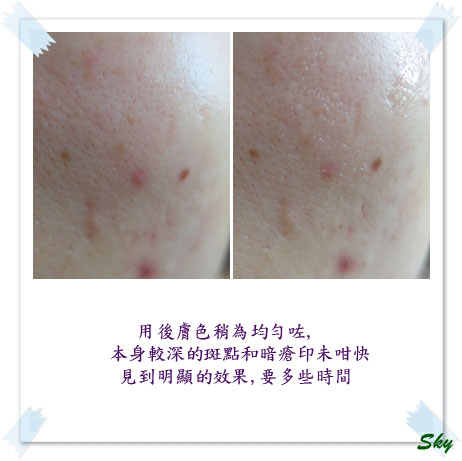 由於我斑點的和暗瘡印已經有一段日子, 所以用咗個多星期, 未咁快見到明顯減淡,但膚色稍為均勻咗.