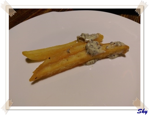 我點了炸薯條配黑松露蛋黃醬和煙鴨胸沙律.