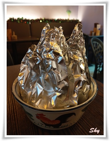 終於上枱, 以鍚紙承載着.