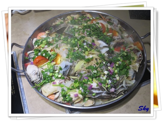 內裡的材料相當豐富, 包括蠔, 沙巴龍躉, 帶子, 花蛤, 海蝦, 蟹, 雞等…