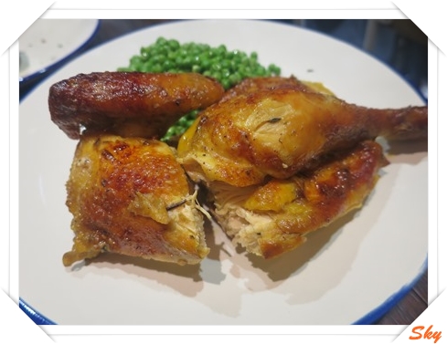 半隻原味烤雞可配一款伴菜, 選擇包括磨菇, 青豆, 甜粟米, 薯蓉, 燴雜菜, 沙律菜或炒時令雜菜, 最後選了青豆.