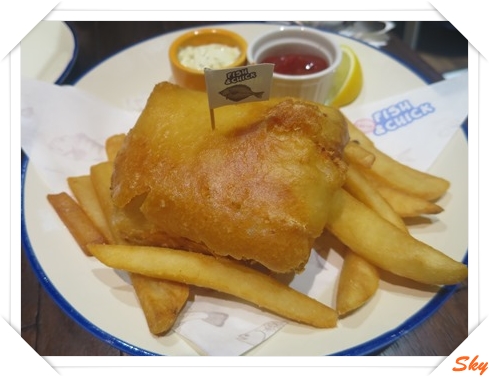 炸魚配薯條, 魚有幾款選擇, 包括石頭魚, 銀鱈魚, 黑線鱈魚, 大比目魚, 鱸魚和盲曹, 最後我地選了大比目魚.