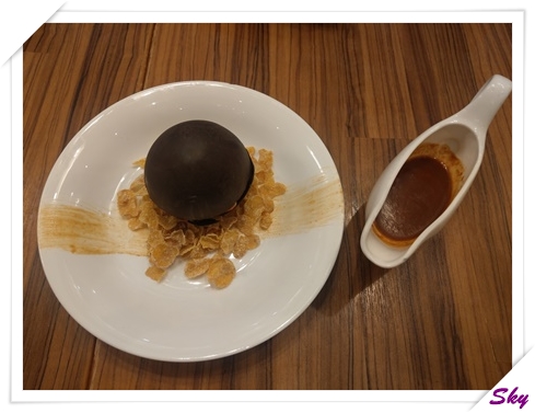 附有焦糖醬, 客人自己淋上朱古力球上, 朱古力便會溶化, 內裡原來係雪糕.
