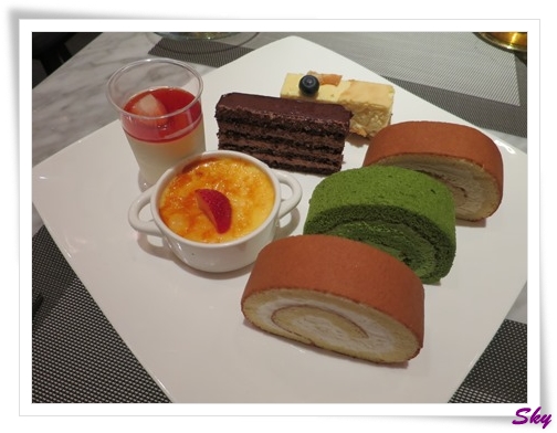 甜點有7款, 包括南青山蛋糕卷, 有原味, 皇室奶茶, 抹茶或芒果, 法式尚蒂利朱古力蛋糕、經典芝士蛋糕、雜莓牛奶凍和法式焦糖燉蛋.