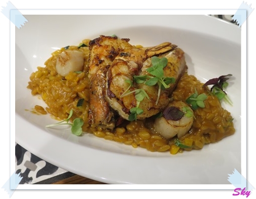 香煎皇帝蝦及帶子伴海皇湯米型粉上枱啦.