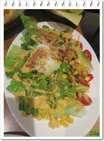 先來個沙律 – 老虎吼沙律. 內裡材料豐富, 有生菜, 蕃茄, 粟米, 烤雞肉, 温泉蛋, 再加上秘製老虎沙律醬.