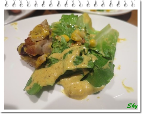 生菜夠新鮮, 入口爽脆, 配上這個帶微辣的醬汁, 感覺特別, 因為平日的沙律醬多不會辣.