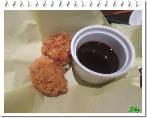 吉列豬肉彈, 外皮幾鬆脆, 不會炸得太硬或者炸粉太厚, 內裡的豬肉不算太乾, 配上燒烤醬一齊食特別惹味.