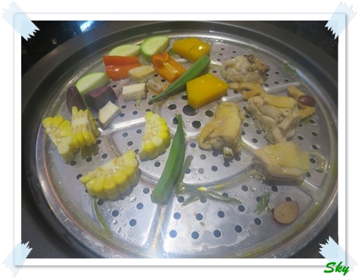 蟲草花紅棗冬菇蒸雞和七色時蔬.