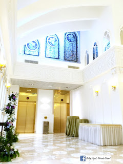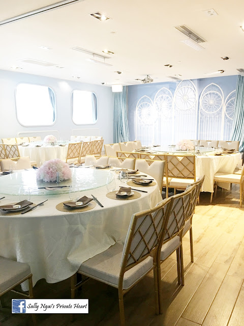 以粉藍白色為設計,加上郵輪式窗口設計,好似去左郵輪搞婚宴呢~