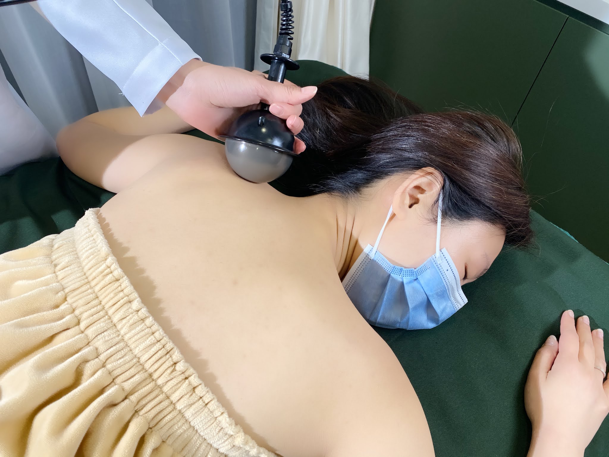理療師用一個會發熱的吸嘴,在身上的經絡遊走, 增加血液循環和組織代謝的能力